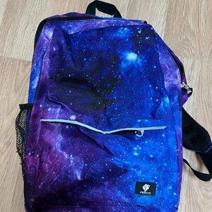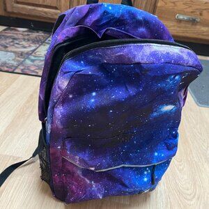 Fenrici brand, purple/blue/black outer space themed children's backpack. This backpack is in excellent condition with no signs of wear other than a tear in the water bottle side pocket.