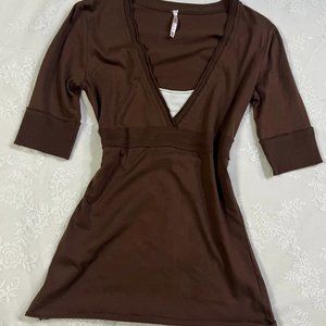 this top is super elena gilbert/bella swan and very early 2010s! i love the deep brown color for the fall <3 the white gives that adorable tank layered under look ! this does have a very tiny tiny hole by tag as seen in third slide, but it’s barely noticeable and your hair will probs cover it ! this shirt is super soft. size M. message me any further questions you may have :)