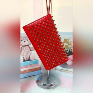 This christian louboutin macaron continental wallet Red with gold spike clutch bag. Perfect for adding an edgy touch to any outfit.