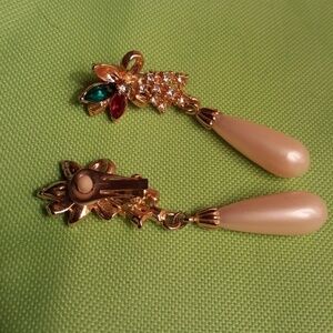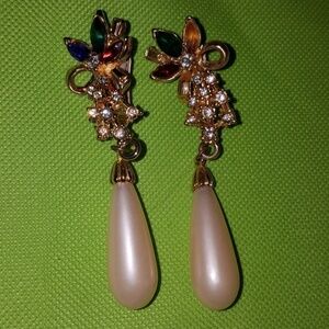 Long faux pearl. Three stones. Red. Green. Purple connected by small christmas tree with rhinestones. One earing is missing a purple stone.