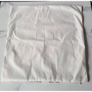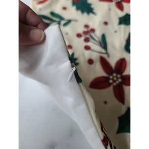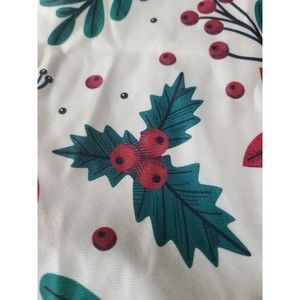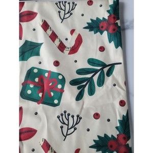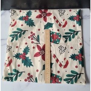 This is a square Christmas themed pillow cover with zip closure and holly/candy cane/gift pattern.