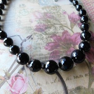 Chunky, graduated size onyx beads with sterling spacer beads and a sterling toggle clasp.