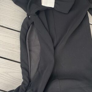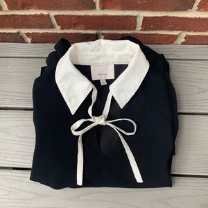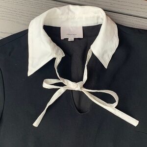 Updated classic black and white shift dress from cinq a sept! Features a slip-on style, split neck with tie, long sleeves with button cuffs, side zipper, flounced hem and made from 69% triacetate, 31% polyester. Size 0. Approx measurements: 34" from top of shoulder to bottom of hem, 16" under arm to under arm, 24" sleeve length. Excellent condition, no tags, with minor dirt/wrinkles throughout. Black and creamy white. Firm price!