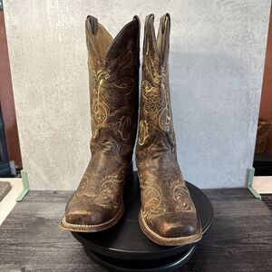 The Circle G Women's Boots in size 8 feature embroidered dragonflies on distressed brown leather. With a mid-calf shaft and square toe, these Western-style boots have a low block heel for comfort. Perfect for those who appreciate cowboy, Southwestern, and cowgirl themes, these leather boots are both stylish and durable. The pull-on closure and regular calf width make them easy to wear for any casual or Western-themed outfit.