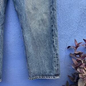 roomy curved wider leg cut / great fade on a darker wash / button fly / high rise / slightly cropped cut / excellent preowned condition