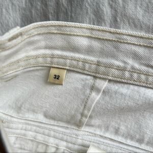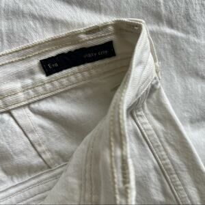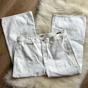 High rise, wide, belt loops, two slip pockets at front, branded tab at front pocket, contrast stitching, two patch pockets at back, cropped, straight hem.
