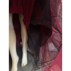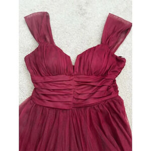Turn heads at your next formal event with this stunning long deep red dress. The sleeveless design and deep V-neckline create an elegant silhouette, while the ruched bodice adds a touch of sophistication. A delicate mesh and tulle overlay with tulle underlay for dramatic effect , flows gracefully, making it perfect for galas, weddings, or any special occasion where you want to make a memorable entrance. Crafted from comfortable polyester, this dress ensures you feel as fabulous as you look. Available in size 3, this dress is brand new and ready to dazzle. Embrace the city studio style with this elegant piece.