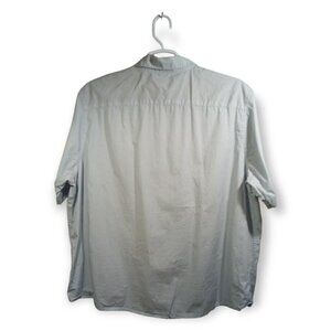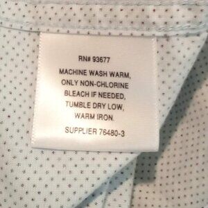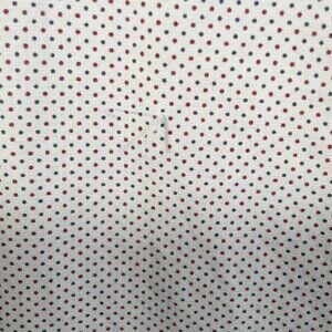 This shirt from Claiborne is a white short sleeve button down with blue and red micro dots and it has an open front pocket. This shirt is a classic stretch fit and has original extra button still attached. This shirt does have one snag on the back that can be fixed by pulling it back through the fabric and is photographed above, otherwise this shirt is in great condition.
