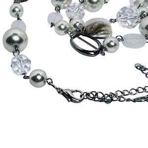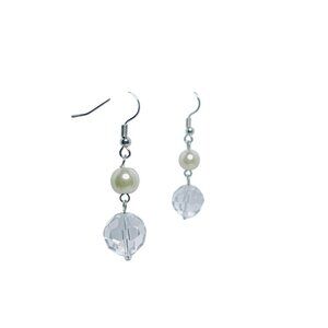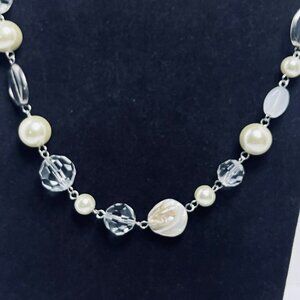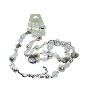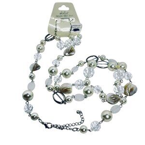 This elegant jewelry set combines silver tone metal, shimmering faux pearls, and clear glass beads. The necklace and earrings offer a polished and refined look.