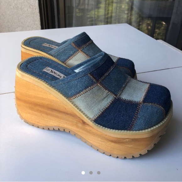 VINTAGE PATCHWORK DENIM PLATFORM WOODEN CLOGS