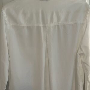This top features a classic dress shirt collar and a relaxed fit, making it a versatile addition to any wardrobe. This white button-down shirt offers a timeless style that can be effortlessly dressed up or down for any occasion. Note frayed spot near pin pic. Shirt is so soft & a true white!