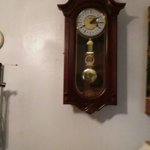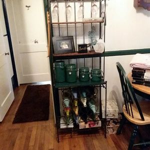 a long leather coat bought from Wilson's a couple years ago and clock is a A $D CLOCK WORKS GREAT .WINE RACK IS GREEN CASTIRON VERY HEAVY ,BOOTS ARE SIZE 6 SILVER SANDALS SIZE 9. WHITE HARLEY JACKET IS SIZE MED .BOB skeck ers are d's 6 black nine west black sandals are size 7 ,and silver ones are guess andsize 7.