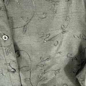 Excellent preowned condition. Black woven collared long sleeve floral embroidered beaded sequinned button up shirt. Polyester material. Approx. measurements: Shoulder to hem 28", pit to pit 22", sleeve from neck to sleeve hem 31". Size L.