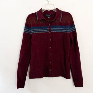 club monaco // maroon shimmer-stripe button-down collared knit top (size M)
