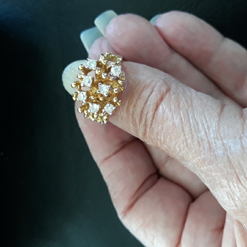 pretty costume ring!--18K GE (gold electroplated) with 7 prong set simulated diamonds--size 7 1/2