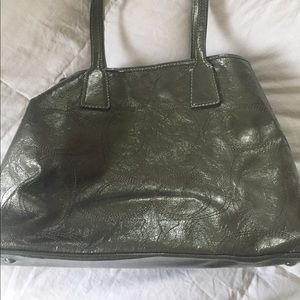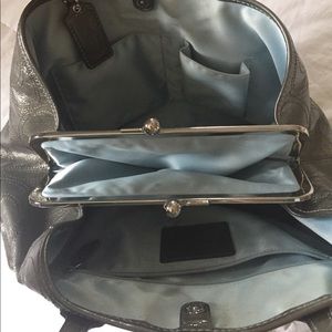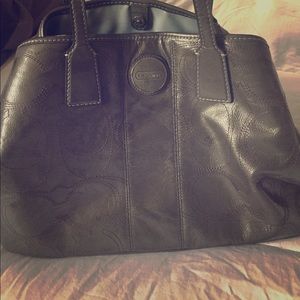 This coach bag is a pewter color with the coach logo stitched all over. Perfect condition! Authentic. Make me an offer!