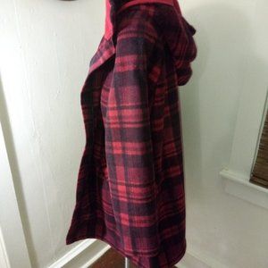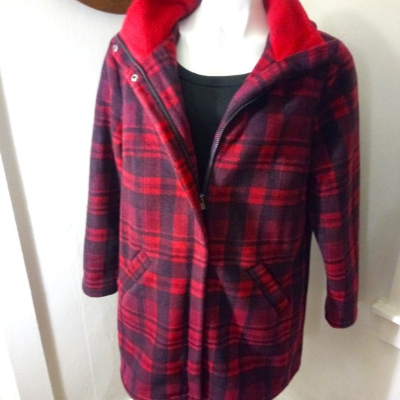 checker red & black large coat, double front zipper, hooded two pockets, front snaps.