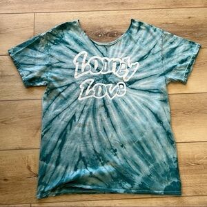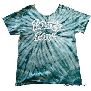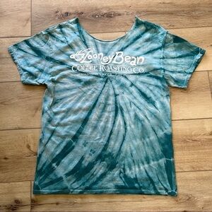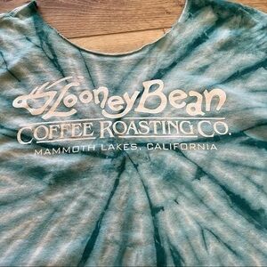 Coffee roasting company cool tie-dye graffiti style short sleeve T-shirt, cut out raw hem neckline, Mammoth Lakes California, looney bean loony love spell outs, measurement shown, no size indicated but could fit a medium or large.