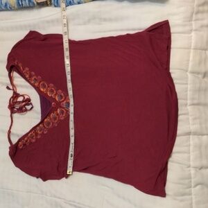 Coline top with lots of fun details make a great twist on a plain tee. A pretty design around a v-neck with some raised sparkly spots. The back has a tie that is braised pink and purple that you can tie or untie as you like.