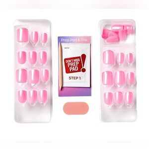 Nail kit contains 30 perfectly manicured press on nails, prep pad, mini nail file, and manicure stick