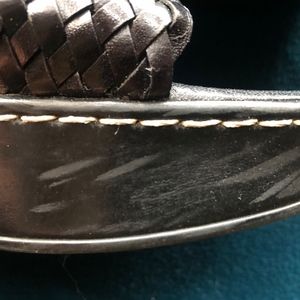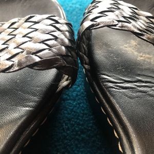 black leather, super comfortable but i have so many sandals i need to reduce my inventory. there are some scuff marks on the sides of the wedges but could probably be buffed out. the foot bed on both is a little wrinkled in terms of wear and tear but wouldn't be seen when worn. basically, they are worn but still in good condition. the contrasting white stitching adds personality and these go with so many things! la canadienne is a very respected brand of footwear and these are so cute!