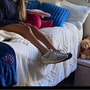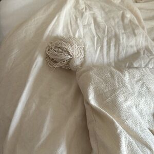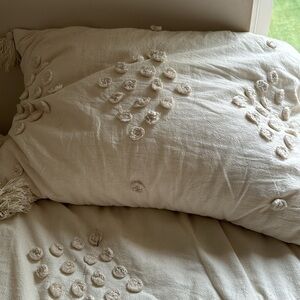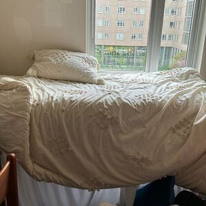 fits a twin XL or twin Dorm bed. One of the tassels is missing on the corner. The bed is $209 and the pillow is $39.50