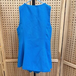 Chic sleeveless vest top, a statement piece that is sure to elevate any wardrobe. This vibrant blue vest features an asymmetrical hemline, adding a modern twist to a classic silhouette. The vest is accentuated with gold button-down closures, contributing a touch of luxury. Its tailored design ensures a flattering fit, making it an ideal layering piece for various occasions.