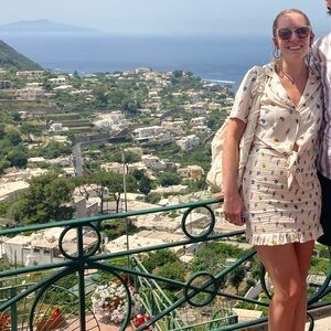 Chic button-up top and skirt set with colorful shell patterns. Perfect for a stylish look. XS top and M bottom