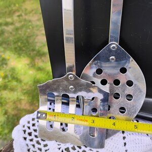 2) slotted flipper / spatula / turner / scalloped / curved - measures approximately 13 1/4" long x 3 1/2" wide - fancy curves in design