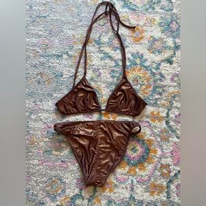 Stylish copper bikini set with a shimmering finish. Perfect for the beach or pool. —cute scrunch detail in the butt!