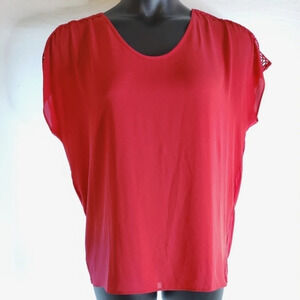 Coral colored blouse that has a stretchy material in the back and a more flowy material in the front. Short sleeves with embroidery on the Shoulders. Very cute, can be dressed up or down. Order it today 🙂❤️