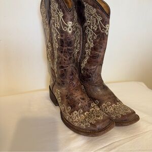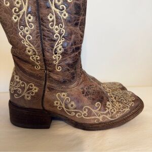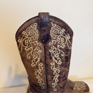 Corral western boots for girls, size 3. Made with genuine brown leather and decorated with elegant scroll embroidery for a classic western look. Durable, comfortable, and perfect for everyday wear or special occasions.
