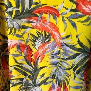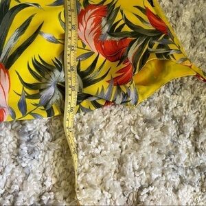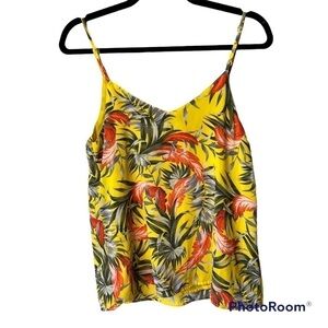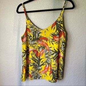 Cotton on tropical patterned silky tank top with adjustable straps, extra small, bright yellow orange gray and beige, separate bright yellow inside lining, flowers leaves trees jungle.