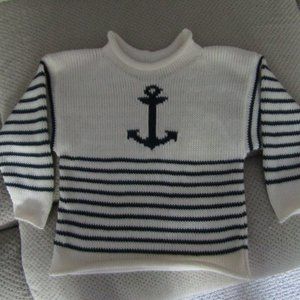 Off white/ navy stripe and anchor. Roll neck hem and cuffs. Perfect to wear alone or layered with a turtleneck.