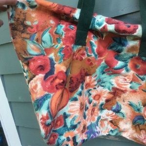Accent International zipper top tote shopper bag...cotton made in India...fruit floral design...lightweight...pretty clean inside and out....approx 20" long 14" high 4" deep with an 11" strap drop