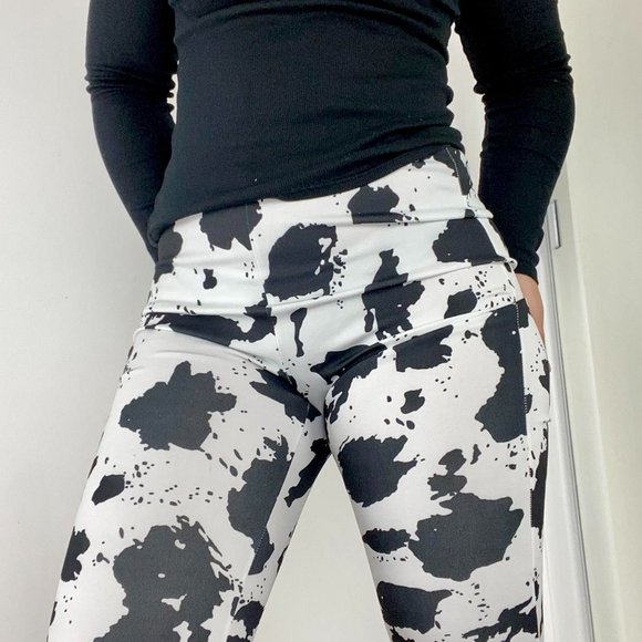 Funky cow-print flared pants from SHEIN. Labeled an XS but I think they stretch to a small just fine. Elasticated waist.