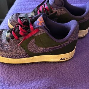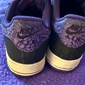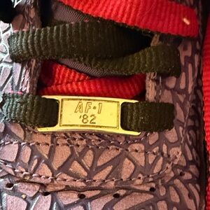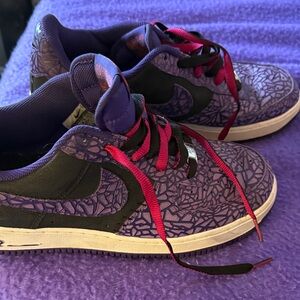 shoes with a striking purple pattern. Features bold red laces and black details. Ideal for making a statement.