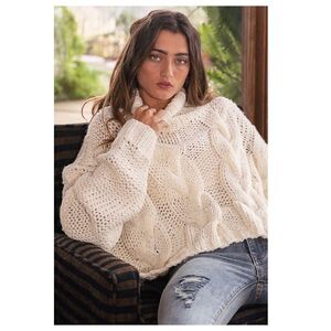 Hand-made turtleneck cable knit sweater detailed with high-low cropped hemline.