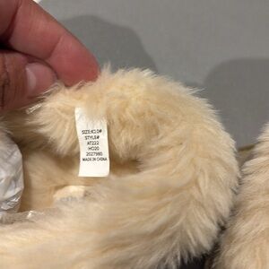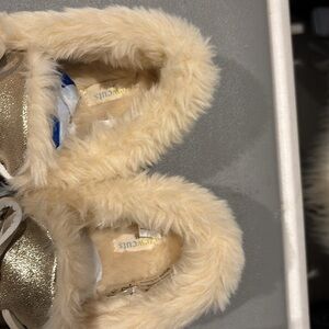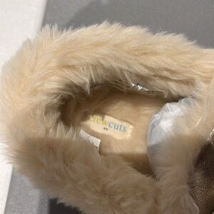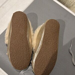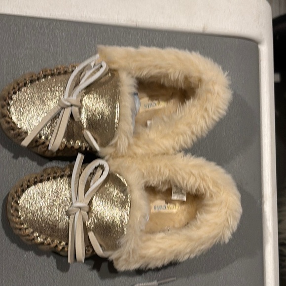 Step into comfort with these stylish gold moccasin slippers. Featuring a plush faux fur lining, these slippers offer warmth and luxury. Perfect for lounging at home.