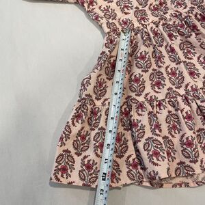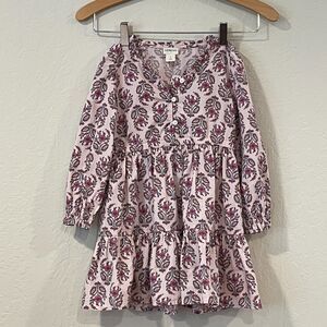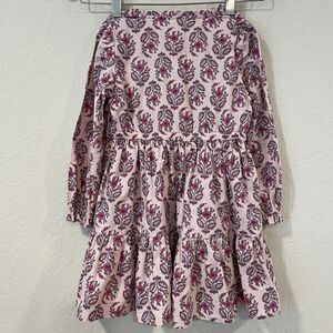 Adorable, feminine CREWCUTS floral dress in girl's size 5. Indian hand block style design print. Tiered design, petite ruffles at collar and sleeve. Gathered wrist, petite pleats at waist. 3-button front closure. Various shades of pink, mauve, plum, blue, cornflower, lavender.