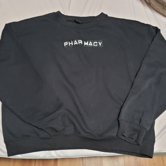 black Pharmacy crewneck. men's size: 2XL tried on for fit. tried to shrink it, but it's still too big/wide for our fit.