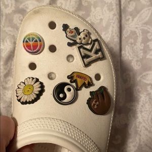 white crocs with charms included. worn but no damage, easy to clean. size 9 women’s