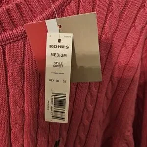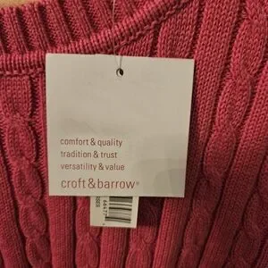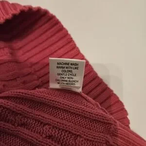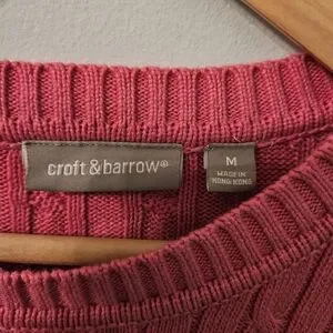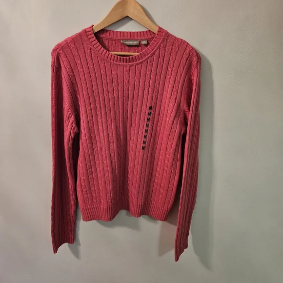 Cable knit sweater in a deep raspberry hue. Crew neckline and long sleeves. Simple, classic knit design for everyday wear.