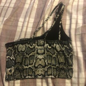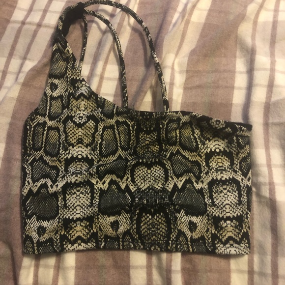 snake print crop top with 3 straps in the back that adds detail, fits xs and Small