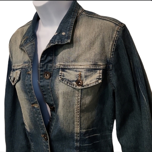 One of a kind skull jean jacket with button front, cuffs and collar. Distressed in just the right places!