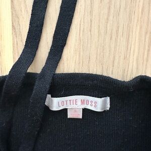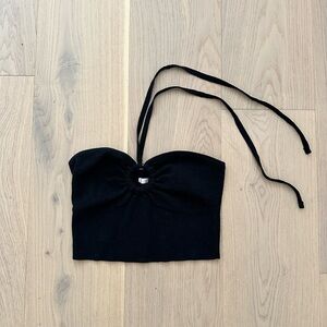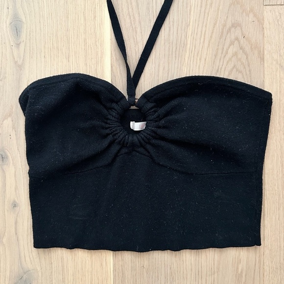 Stretchy black halter top. Cropped fit. Tortoise shell ring. Ties at the neck.