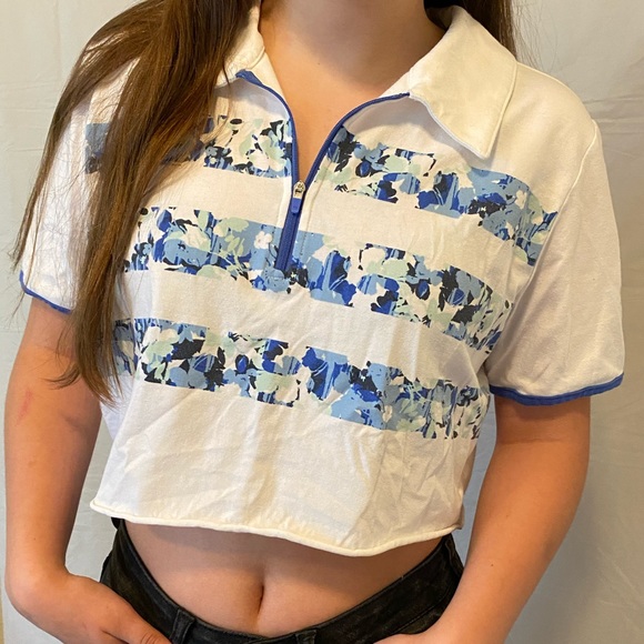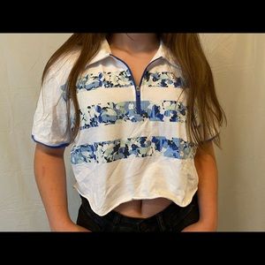 cute , blue and white pattern , great for a sporty look or paired with sweats ! tends to wrinkle but comes out with ironing or steamer. quarter zip