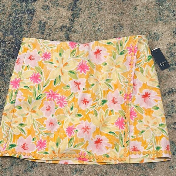 Vibrant floral skort. Features yellow, pink, and green hues. Perfect for casual outings.
