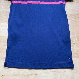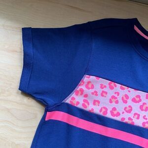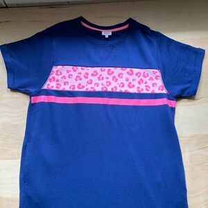 Pretty cabana by crown & ivy dress is perfect for any spring or summer day. It is navy blue with neon pink accents. Capped rolled sleeves. 1” slits at hemline. Two side pockets. Medium weight. Underarm flat across is 22”. Length is 38”.
