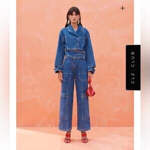 Go for it with the Georgia Jacket in Indigo. This beloved Cult Gaia piece is now available in stunning denim with contrast denim top stitch. Her wide shoulder and fitted waist band create a sharp silhouette. There are pleats on the back and studs on the front and back. Adjustable Cult Gaia hook-and-eye closures are on the sleeves and belt, providing adjustable wear.